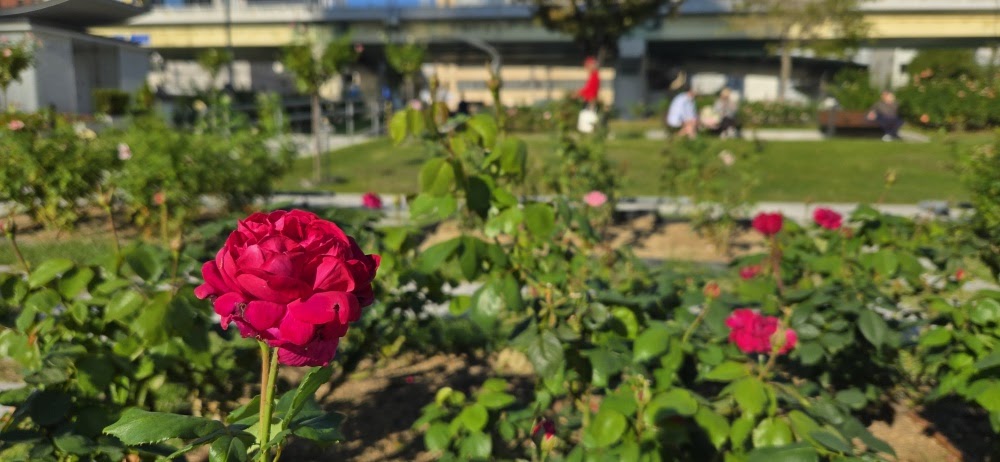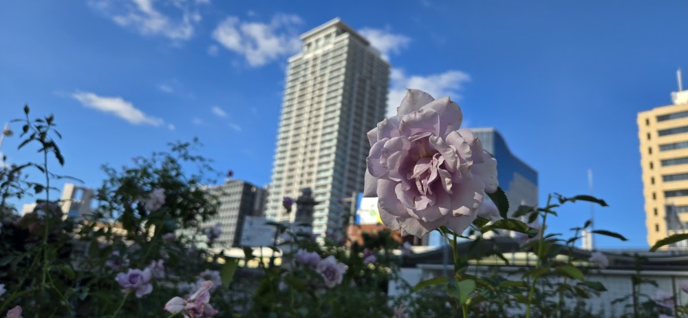 今回は、大人っぽい紫のバラも発見しました。背後にビル群が見えるのが「都会のオアシス」っぽくて個人的に好きな景色です。